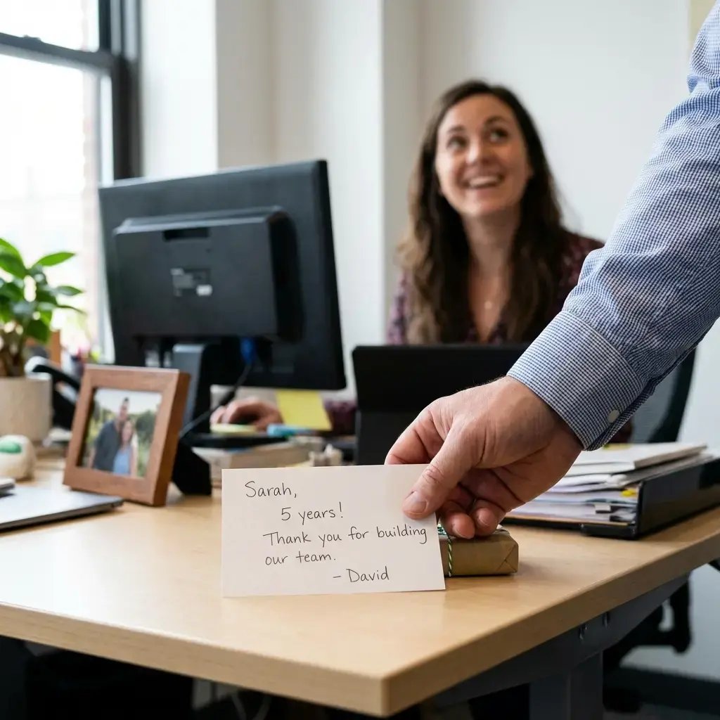 Start small today. Work anniversaries this month. A simple system for capturing moments as they happen. Brief acknowledgements in your next team meeting.